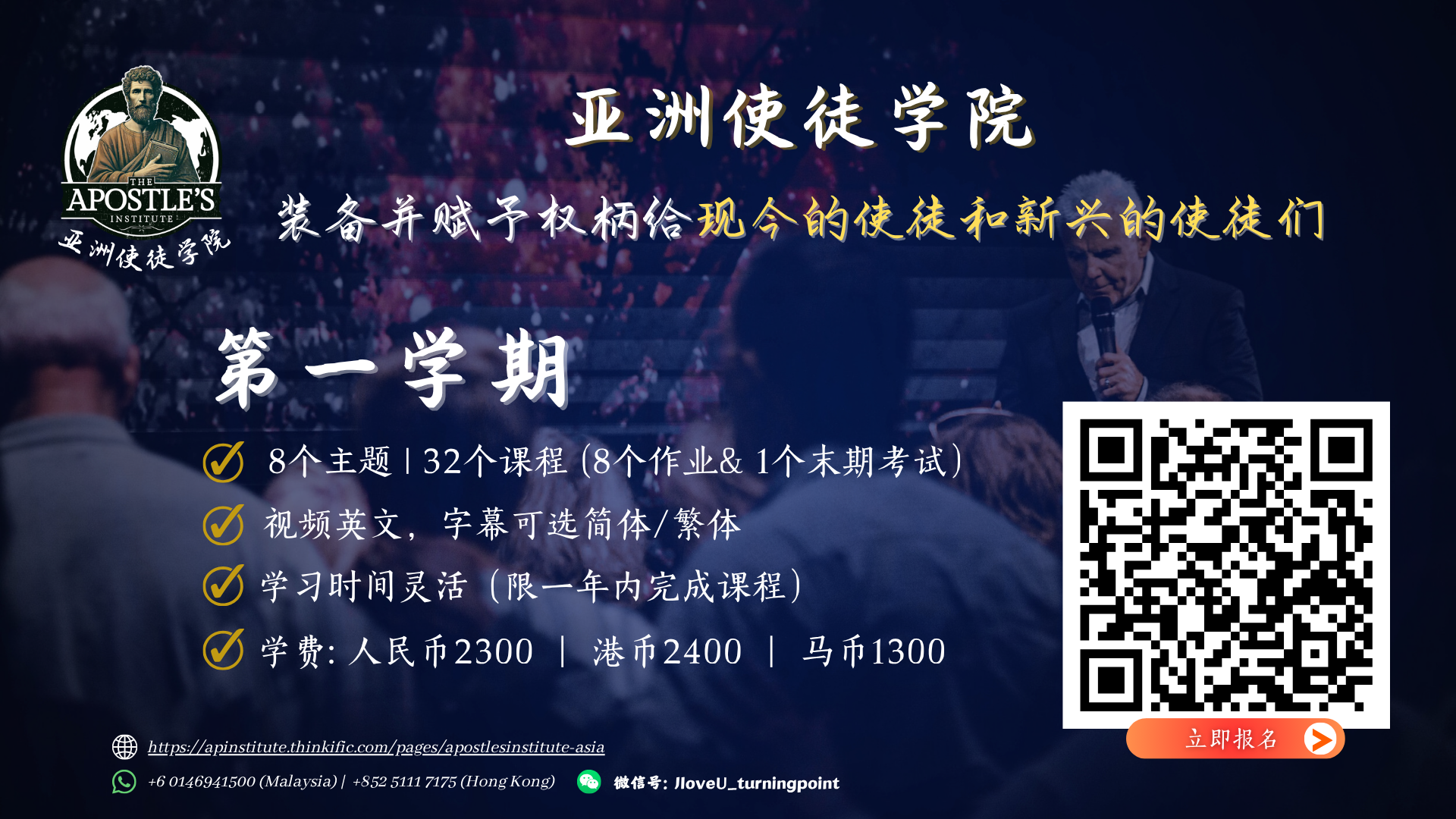 约翰下监以后,耶稣来到加利利,宣传神的福音,说:“日期满了,神的国近了!你们当悔改,信福音。” - 马可福音1:14-15 这个宣告具有改变世界的力量。它不仅谈到关于信徒个人生命的改变和赋能,它更关乎国家和文化的改变,也谈到了国家和文化正在被改变。这意味着神将通过祂的门徒来影响并改变地上的生命。人们和文化将被重塑,变得更像天堂而不是地狱! 这需要使徒们被主兴起并安置在适当的位置上。耶稣用了三年半的时间来培养并赋予使徒们权力。在马可楼里,唯一领受了恩赐的就是使徒,这是有目的的。神有意让祂的教会Ekklesia (天国议会),也就是神在地上的治理的权柄,本质是具有使徒性的,其他四种侍奉恩赐包括先知、教师、传福音者和牧师,都是从耶稣首先设立的使徒那里出来的。这是因为神的教会是主用来在全地扩展神国度治理的工具。这仍然是祂的热情所在。 然而,若使徒们没有被认可、被授权和委任,这一切就无法实现。使徒是主所授权的,使徒们的本质就是扩展、扩张和加强神在地上的统治。然而,如果没有培训和装备,就不可能做到这一点。这正是 “使徒学院”(The Apostle’s Institute) 的宗旨。我们的目标是装备现有和新兴的使徒,使他们能完成神所命定的呼召。 课程将分为两个学期,由韩若伯使徒(Ap. Robert Henderson) 及其他使徒来教导和传授真理,使新一代的使徒有改变世界的能力。邀请你加入这个改变历史和生命的培训!