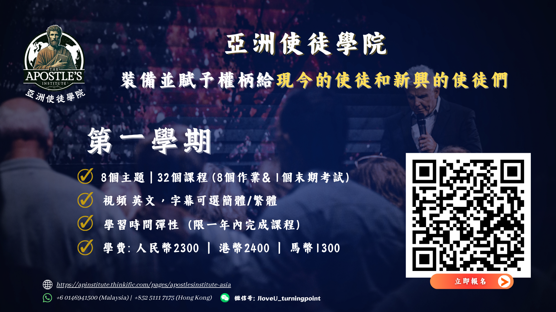 約翰下監以後,耶穌來到加利利,宣傳神的福音,說:「日期滿了,神的國近了!你們當悔改,信福音。」- 馬可福音1:14-15 這個宣告具有改變世界的力量。它不僅談到關於信徒個人生命的改變和賦能,它更關乎國家和文化的改變,也談到了國家和文化正在被改變。這意味著神將透過祂的門徒來影響並改變地上的生命。人們和文化將被重塑,變得更像天堂而不是地獄! 這需要使徒們被主興起並安置在適當的位置。耶穌花了三年半的時間來培養並賦予使徒們權力。在馬可樓裡,唯一領受了恩賜的就是使徒,這是有目的的。神有意讓祂的教會Ekklesia (天國議會),也就是神在地上的治理的權柄,本質是具有使徒性的,其他四種侍奉恩賜包括先知、教師、傳福音者和牧師,都是從耶穌首先設立的使徒那裡出來的。這是因為神的教會是主用來在全地擴展神國治理的工具。這仍然是祂的熱情所在。 然而,若使徒們沒有被認可、被授權和委任,這一切就無法實現。使徒是主所授權的,使徒們的本質就是擴展、擴張和強化神在地上的統治。然而,如果沒有培訓和裝備,就不可能做到這一點。這正是 「使徒學院」(The Apostle’s Institute) 的宗旨。我們的目標是裝備現有和新興的使徒,使他們能完成神所命定的呼召。 課程將分為兩個學期,由韓若伯使徒(Ap. Robert Henderson) 及其他使徒來教導和傳授真理,使新一代的使徒有改變世界的能力。邀請你加入這個改變歷史和生命的訓練!